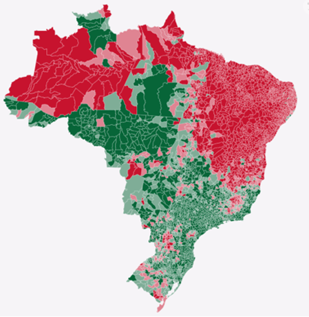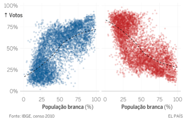 Los mapas publicados por El País también muestran que Bolsonaro ganó en las ciudades y distritos donde predomina la población blanca, mientras que Haddad ganó en estados y ciudades donde la población negra es la mayoría. En este análisis, es importante recordar la convergencia de raza/color e ingreso.