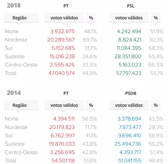 Bolsonaro ganó la región Sur, con el 68% de los votos, seguido por el Medio Oeste (66%) y el Sudeste (6%). PT ganó en todos los estados del Noreste con el 69% de los votos de la región.