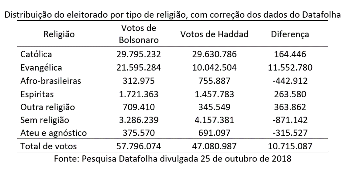 En el artículo publicado por la plataforma web Ecodebate, el demógrafo José Eustáquio Diniz Alves analizó los patrones del voto religioso para concluir que, al considerar todas las religiones e incluso las denominaciones protestantes, los evangélicos han votado masivamente por Bolsonaro: 69%. Esto significó una ventaja para Bolsonaro de 11,6 millones de votantes. Esta cifra es más grande que la diferencia general entre los candidatos, que fue de aproximadamente 10 millones. Esto permite concluir que el voto evangélico ha sido definitivo de los resultados.