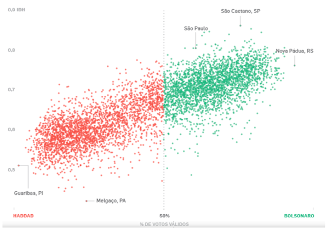 Un informe del periódico Estado de São Paulo revela que Haddad ganó en municipios con Índice de Desarrollo Humano (IDH) más pequeño, mientras que Bolsonaro ganó en el 98% de las ciudades con IDH más alto.