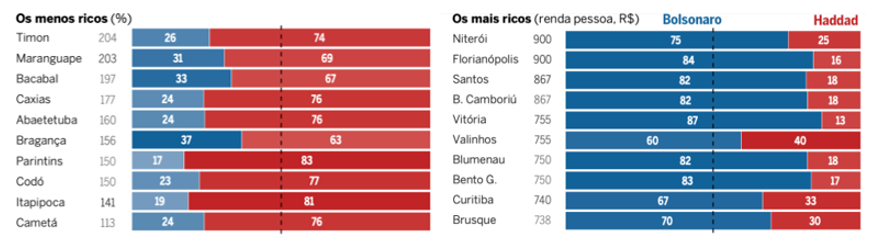 Del mismo modo, periódico El País reportó una fuerte división entre los dos candidatos de acuerdo con los ingresos mensuales. Haddad ganó en los municipios más pobres y Bolsonaro ganó en los más ricos.