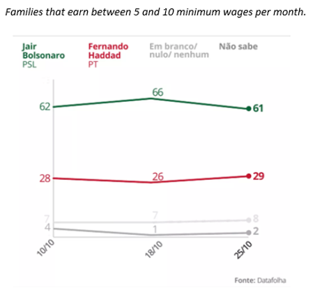Entre los votantes que reciben entre cinco y diez salarios mínimos por mes, el 66% declaró que votaría por Bolsonaro. Ese fue el grupo donde el candidato recibió el número relativo más grande cuando consideramos los grupos por ingreso. Haddad ganó entre las familias que reciben entre las familias que reciben entre dos y cinco salarios mínimos.