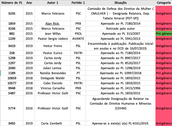 Atualmente na Câmara dos Deputados estão tramitando 15 projetos de lei relacionados à “ideologia de gênero”. Sendo 8 deles apresentados ainda no primeiro semestre de 2019, 3 referentes ao ano de 2018, 2 referentes ao ano de 2016 e 2 referentes ao ano de 2016.