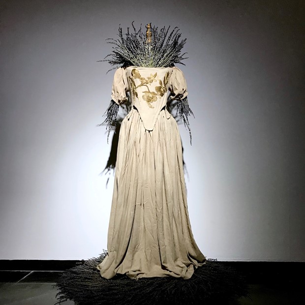 Na sua obra “Plague Dress”, o vestido ao estilo dos anos 1665 é feito de seda crua, tingida à mão com casca de nozes em referência ao famoso herborista da época Nicholas Culpeper, que recomendava as nozes como tratamento para a peste. O vestido é aplicado com bordados originais do século XVII que a artista impregnou com o DNA da bactéria Yesinia pestis (Praga), que ela extraiu das bactérias mortas da praga. O vestido é recheado e cercado de lavanda, que historicamente eram levadas sob o nariz das pessoas durante a Grande Peste de Londres para cobrir o fedor da infecção, e também prevenir a doença, que se acreditava ser causada por ‘ar ruim’ ou ‘miasmas’.