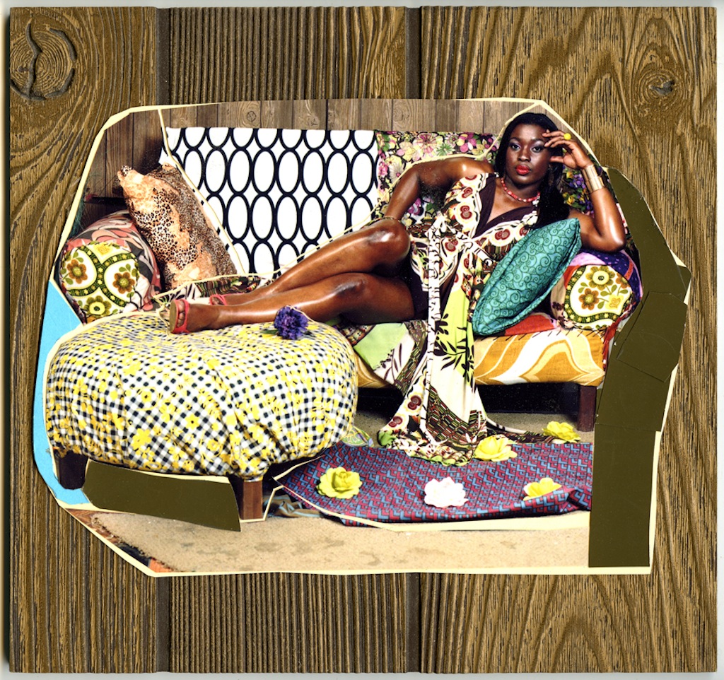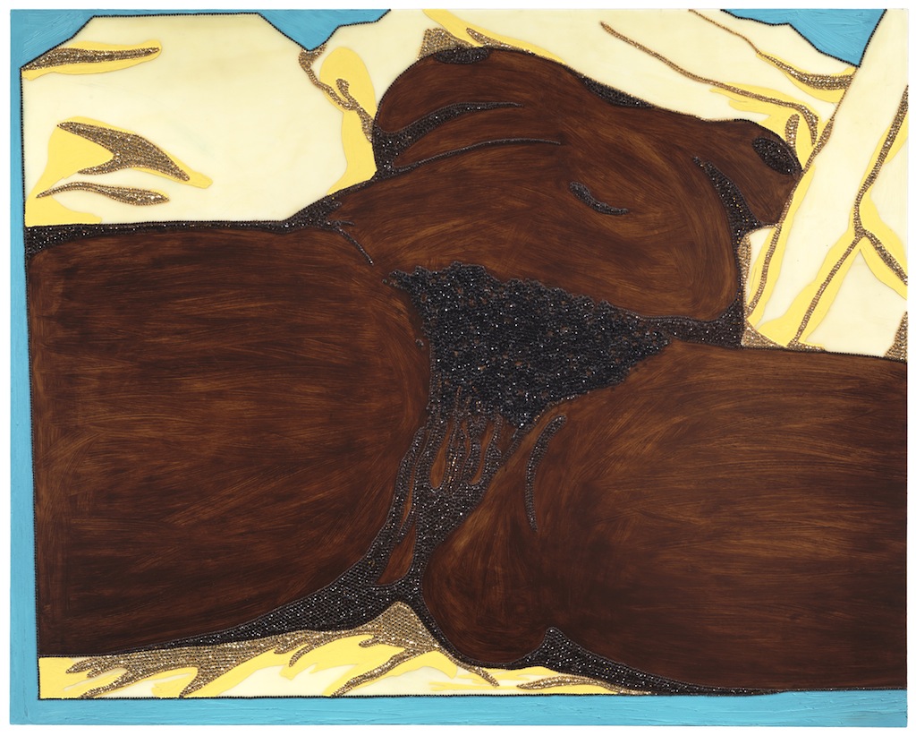 Mickalene Thomas. Origem do Universo 1, 2012; strass, acrílico e óleo no painel de madeira; 48 x 60 polegadas. Cortesia do artista.