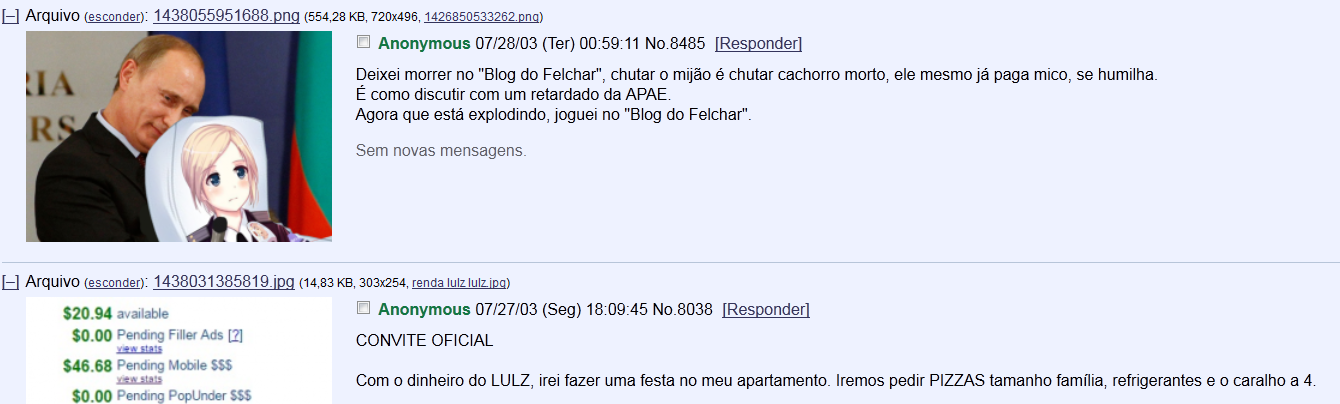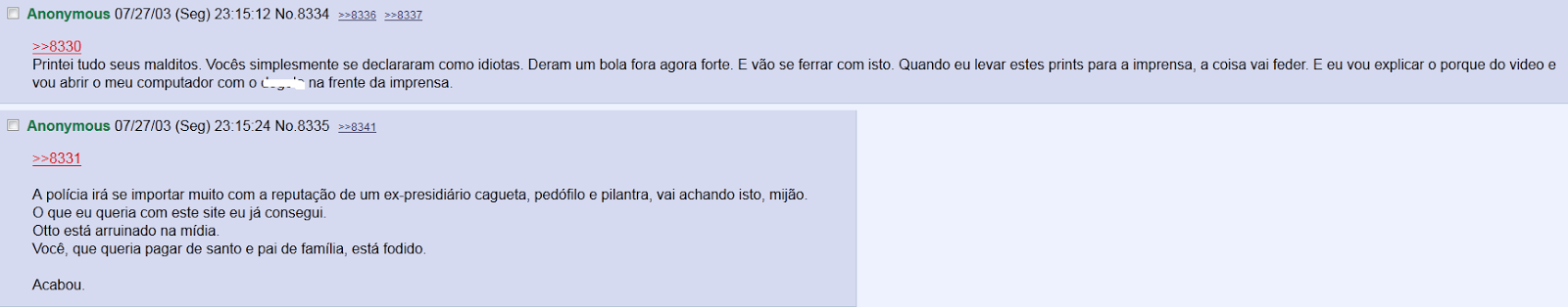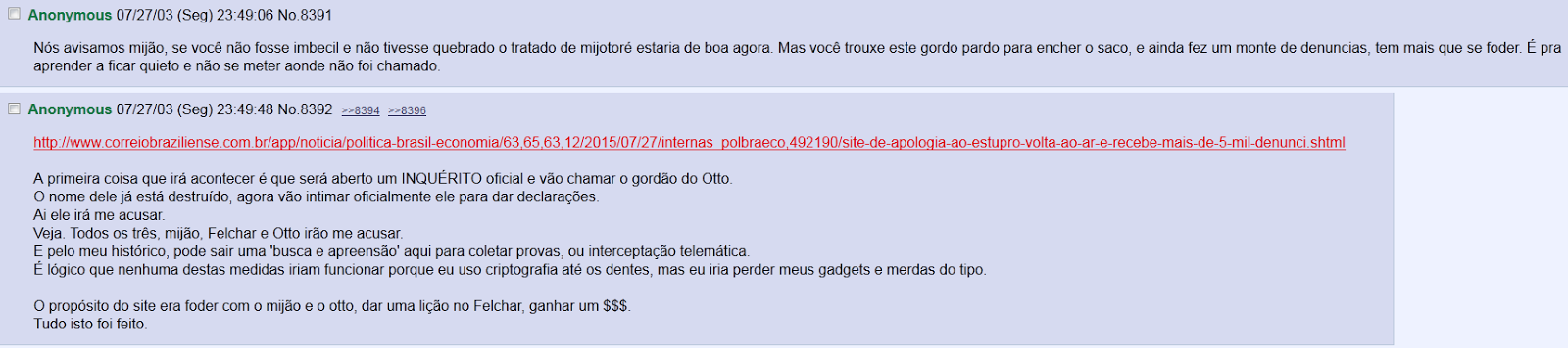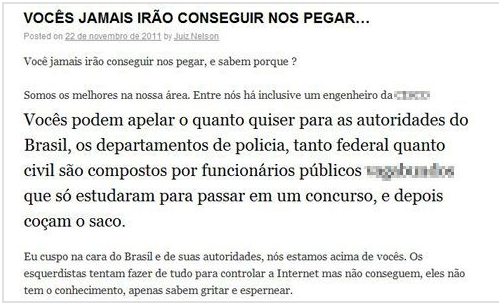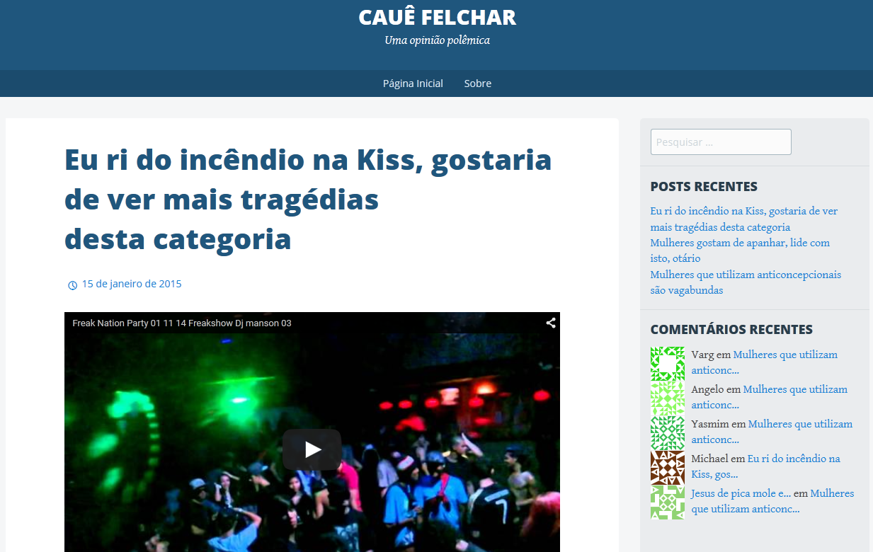 No final, apesar da turma do chan votar maciçamente em Emerson para a autoria do site, Marcelo decidiu assinar com o nome de Robson Otto. Ontem à noite, durante meia hora, quem clicava no site era direcionado ao famoso vídeo de Emerson na Índia. Hoje, é direcionado ao “blog” de Cauê Felchar, feito em janeiro, celebrando o incêndio da boate Kiss. Apesar desses três definitivamente não serem flor que se cheire, não são os autores do mais recente site de ódio.