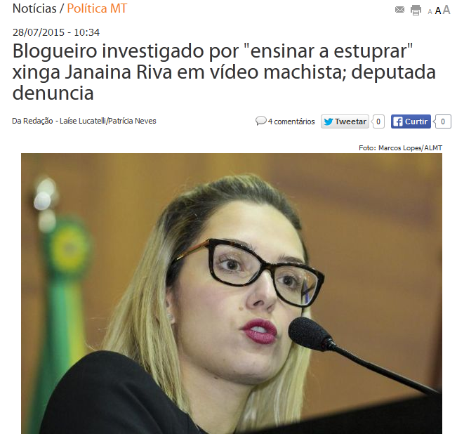 Além disso, Robson Otto já havia feito vídeos xingando a deputada estadual Janaína Riva (PSD-MT). Seu ódio contra Janaína é por ela ter cobrado uma maior participação feminina na política.