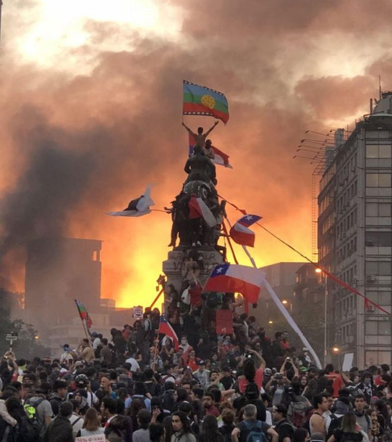 Faced with the call to avoid paying the metro fare in Santiago on Friday 18th October, the government’s response was to shut down all metro stations of the capital, unleashing fury reactions, urban chaos and perplexity. From then on, things happened very fast: nationwide protests, the burning of some metro stations and the looting of various establishments that represent the heart of the Chilean neoliberal model (banks, supermarkets, electricity companies and pharmacies). All this occurred without the protection of police force, who just let things happen. Moreover, at that precise moment, the President was photographed eating pizza celebrating a relative’s birthday in a wealthy neighborhood in Santiago while the city was in total chaos. Hours later, he decreed a state of emergency and imposed a curfew letting the military take control of law and order in the city.